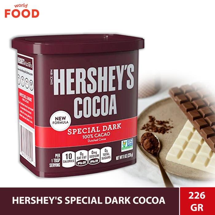 HERSHEY'S COCOA SPECIAL DARK 100% Cacao Cocoa HERSHEY'S cocoa Gluten Free Kosher Nutrition Information Nutrition Facts Servings Per Container about 45 Serving size 1 tbsp (5g) Amount per serving Calories 10 % Daily Value* Total Fat 0.5g 1% Saturated Fat 0g 0% Trans Fat 0g Cholesterol 0mg 0% Sodium 0mg 0% Total Carbohydrates 3g 1% Dietary Fiber 2g 6% Total Sugars 0g Includes 0g Added Sugar 0%