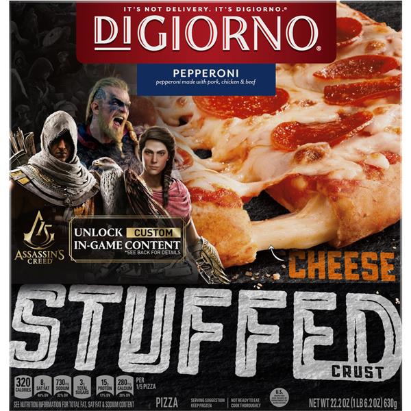 Nutrition Facts for DiGiorno Pepperoni Pizza w/ Stuffed Crust Nutrition Facts. Serving Size. pizza. 0.2 pizza = 126g. Amount Per Serving. 320. Calories % Daily Value* 25%. Total Fat 16g. 40% Saturated Fat 8g Trans Fat 0g. 13%. Cholesterol 40mg. 32%. ... DiGiorno Pepperoni Pizza w/ Thin Crust. 0.2 pizza (125g) Log food: DiGiorno Three Meat Pizza w/ Stuffed Crust. Digiorno Hand Tossed Pepperoni Frozen Pizza 9.3oz Remove pizza from carton and freshness wrap. Place pizza directly on center oven rack. Bake 17 to 19 minutes or until cheese is melted and edges are golden brown.MICROBAKE INSTRUCTIONS: Preheat oven to 425°F. Pull tear strip along carton edge and peel back carton top along perforations. Do not tear off carton top. DiGiorno Frozen Pizza - Primo Frozen Pepperoni Pizza - Instacart Nutrition Nutrition Facts Serving Size 122.00 g Servings Per Container 4 Amount Per Serving Calories 320 % Daily Value Total Fat 15g 23% Saturated Fat 7g 35% Trans Fat 0g Cholesterol 30mg 10% Sodium 790mg 33% Total Carbohydrate 32g 11% Dietary Fiber 2g 8% Sugars 4g Protein 15g Percent Daily Values are based on a 2,000 calorie diet. Popular Brands