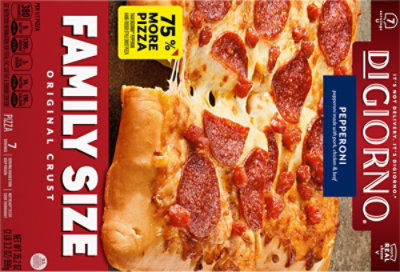 DiGiorno Frozen Pizza - Primo Frozen Pepperoni Pizza - Instacart Nutrition Nutrition Facts Serving Size 122.00 g Servings Per Container 4 Amount Per Serving Calories 320 % Daily Value Total Fat 15g 23% Saturated Fat 7g 35% Trans Fat 0g Cholesterol 30mg 10% Sodium 790mg 33% Total Carbohydrate 32g 11% Dietary Fiber 2g 8% Sugars 4g Protein 15g Percent Daily Values are based on a 2,000 calorie diet. Popular Brands
