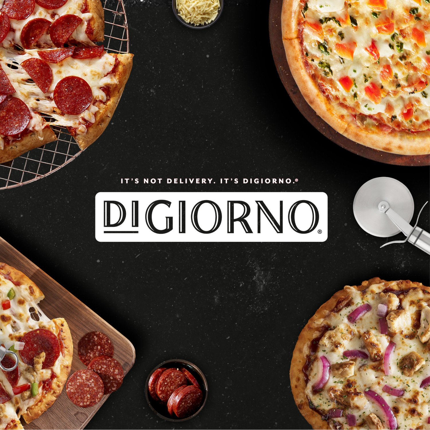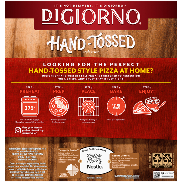 Digiorno Hand Tossed Pepperoni Frozen Pizza 9.3oz Remove pizza from carton and freshness wrap. Place pizza directly on center oven rack. Bake 17 to 19 minutes or until cheese is melted and edges are golden brown.MICROBAKE INSTRUCTIONS: Preheat oven to 425°F. Pull tear strip along carton edge and peel back carton top along perforations. Do not tear off carton top.