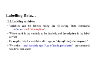 PDF Syntax label variableattaches a label (up to 80 characters) to a variable. If no label is specified, anyexisting variable label is removed. label definedefines a list of up to 65,536 (1,000 for Small Stata) associations of integers andtext called value labels. Value labels are attached to variables bylabel values.