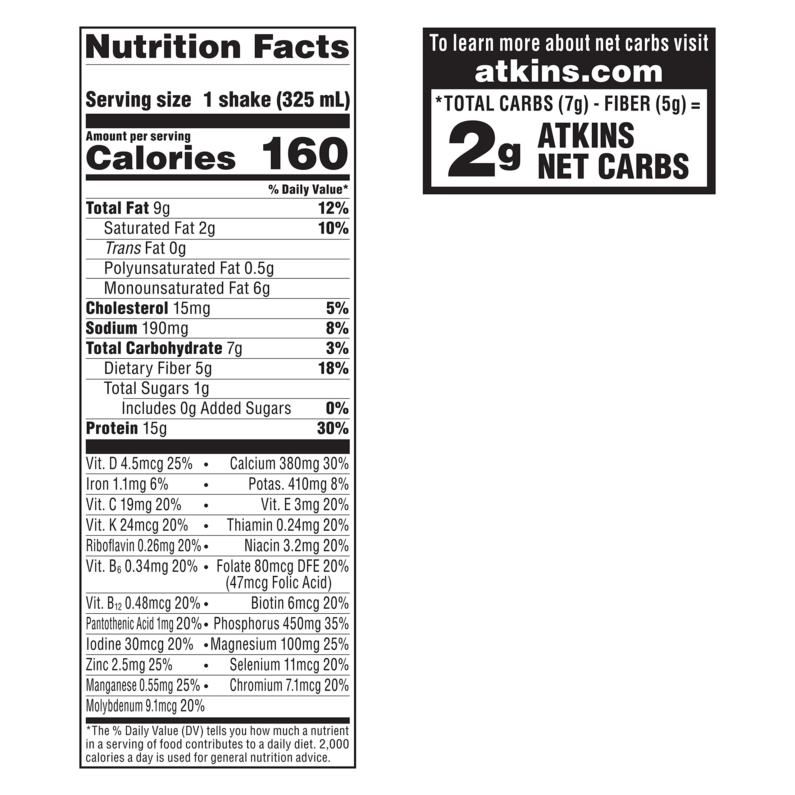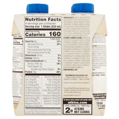Atkins Nutritionals Ready-to-Drink Shakes - Netrition.com Nutrition Facts ; Net Carbohydrates, 4 mcg mg g I.U. mcg mg g I.U., null% null% ; Protein, 15 0 mcg mg g I.U. mcg mg g I.U., 28% null%.
